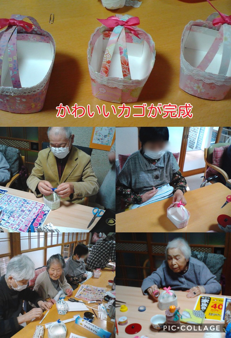 デイサービスセンターほほえみです。牛乳パックを使ってかご作りをしました。素敵なかごかできあがりましたね。教えて下さったボランティアの皆様ありがとうございました。