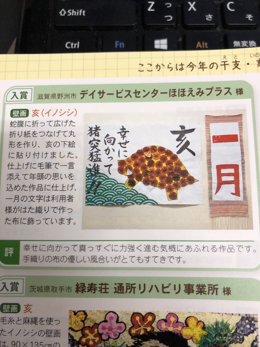 デイサービスセンターほほえみプラスです。自慢のレク.クラフト!入賞致しました♪( ´▽`)蛇腹に折って広げた折り紙をつなげて丸型を作り、亥の下絵に貼り付けて作品を仕上げました♪( ´▽`)