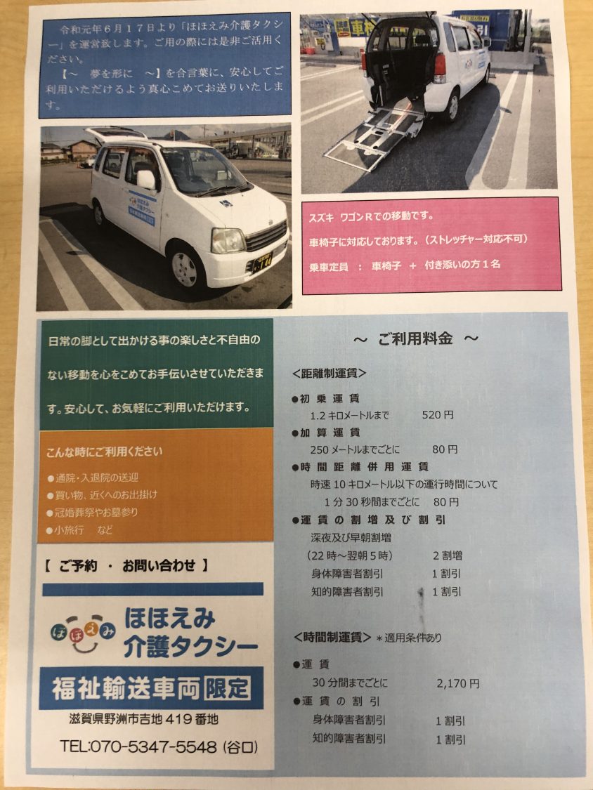 令和元年6月17日より【ほほえみ介護タクシー】を運営致します。御用の際には是非ご活用下さい。